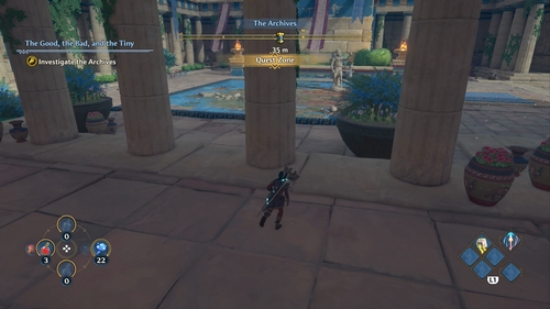 Les Archives sont un grand complexe de bâtiments de forme carrée avec une grande cour en son centre. Il se trouve à l’ouest du marqueur de voyage rapide de la Déesse de la Sagesse (l’emplacement de reconnaissance que nous venons de visiter) et se trouve juste à côté de la paire de têtes de serpent de pierre géantes (hydre) qui sortent de la falaise à proximité.