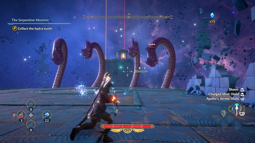 Nous voulons utiliser l’arc pour la majorité du combat, et les flèches d’Apollo en particulier, si vous voulez que chaque tir compte. Cependant, dans certains cas, des armes de mêlée peuvent entrer en jeu. Lorsque le boss tente de vous écraser avec l’une de ses têtes, la tête restera sur le sol de l’arène pendant une courte période, vous permettant de l’attaquer avec des armes de mêlée – c’est une excellente occasion d’effacer rapidement une partie de sa santé.