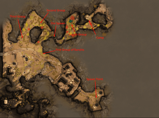 Vous devrez d’abord vous rendre à San Matheus. Cet emplacement est très pratique car il y a un camp à proximité que vous pouvez utiliser pour passer rapidement le temps et réapparaître tous les ennemis, non seulement cela, mais vous pouvez vous reposer pendant 6 jours au lieu de 4, pour également faire réapparaître les ressources. De cette façon, vous pouvez obtenir des tonnes de minerai et de minerai raffiné pour la fabrication tout en augmentant de niveau. L’image ci-dessous vous montre l’emplacement de chaque groupe de bandits et où se trouve le camp.