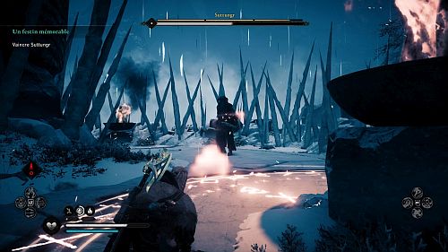 Finalement, et à de nombreux moments, Suttungr lèvera sa main gauche et pleuvra sur une tempête de grêle de glace. Cela ne peut pas être esquivé et Havi sera gelé sur place pendant que la barre de santé s’épuise. La seule façon de vous sauver est de vous diriger vers les feux , qui sont mis en évidence comme de petits cercles contenant des chaudrons de feu.