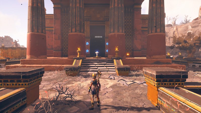 Tenez-vous au commutateur à l’intérieur et utilisez la force d’Herakles pour aspirer l’un des rochers du pad. Cela vous permet d’utiliser l’interrupteur pour désactiver la barrière de manière permanente et vous permettre de déplacer les rochers hors du chemin de votre flèche. Maintenant, vous pouvez tirer en toute sécurité votre flèche d’apollon sur la torche à l’intérieur et relever le défi.