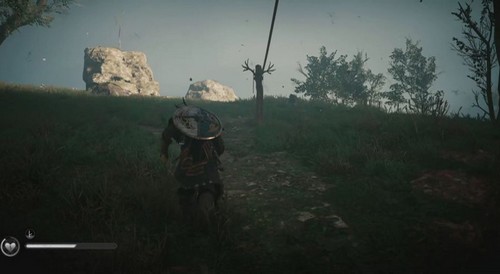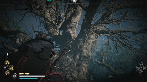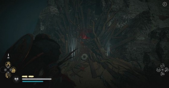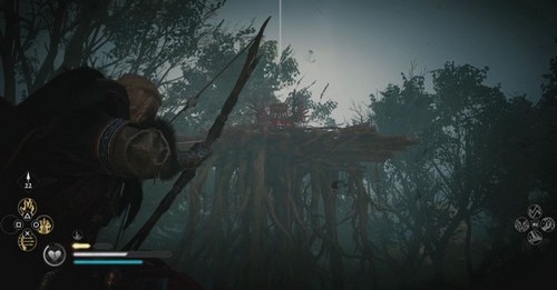 Le symbole est au sommet de l’arbre du milieu. Sur le côté ouest se trouve une flèche en pierre que vous pouvez escalader et tirer une flèche à partir de là pour la détruire.