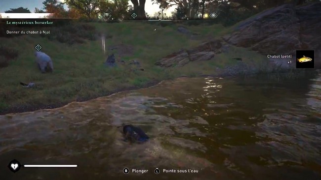 Pour la suite, suivez Njal. Finalement, il s’arrêtera au bord du lac. Utilisez votre arc et votre vision pour attraper une chabot pour Njal. Donnez les poissons à Njal.