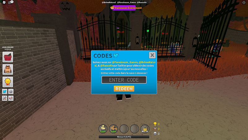 newyear2021 – Échangez le code contre une caisse Premium gratuite30k – Échangez le code contre une caisse de citrouille gratuite (Nécessite une Tower Pumpkin)DOUBLEBLOXIES – Utiliser le code pour un Skin cow-boy (Nécessite une Tower cow-boy)ICYFREEZE – Utiliser le code pour le skin Freezer (Nécessite une Tower Freezer)W33KLICODE – Utiliser le code pour 65 x Points d’XP5KMILESTONE – Utiliser le code pour le Skin Twitter MinigunnerB1RDHUNT3R – Utiliser le code pour une troupe de chasseurs gratuite1pumpkin – Échangez le code pour une caisse de citrouille gratuite