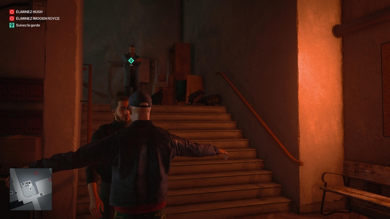 Dans le même bâtiment, vous devez monter à l’étage. Il existe de nombreuses façons de procéder. Par exemple, avant que le garde ne vienne vous escorter à l’extérieur, vous pouvez prendre un virage à droite, distraire les deux gardes par les escaliers et les assommer. Ou vous pouvez laisser le garde vous escorter à l’extérieur et entrer dans le bâtiment par les toits avec un déguisement.