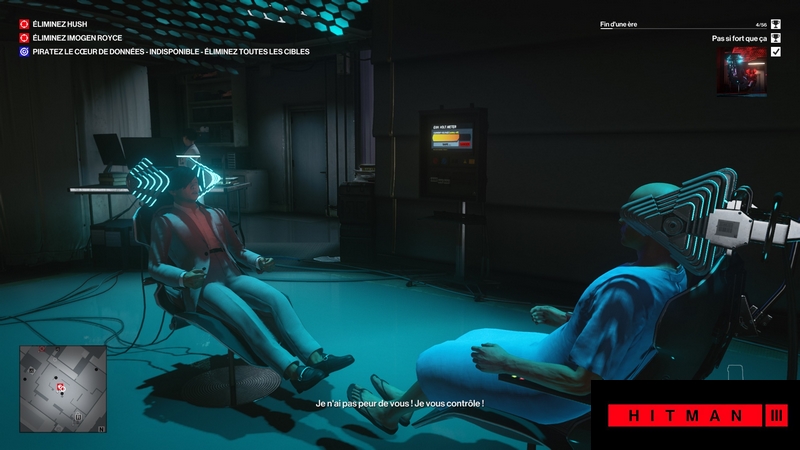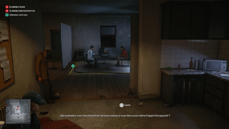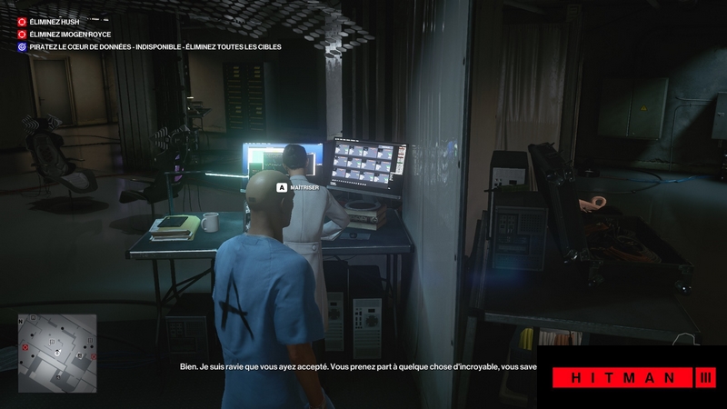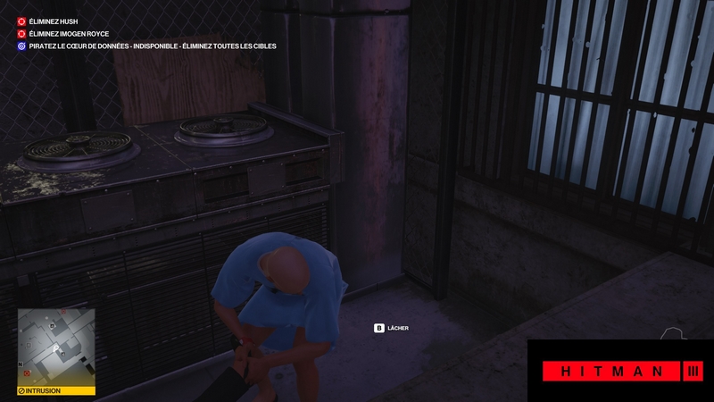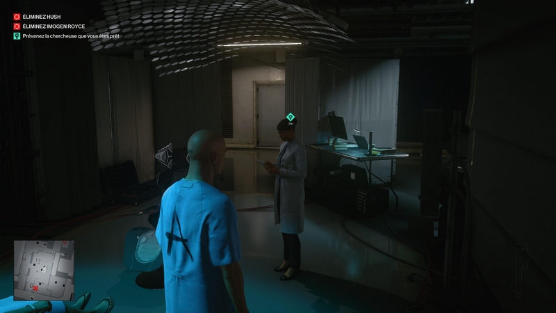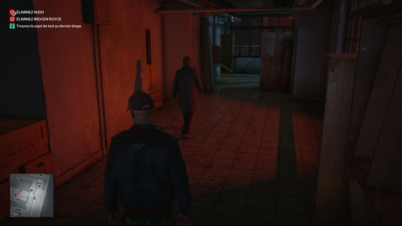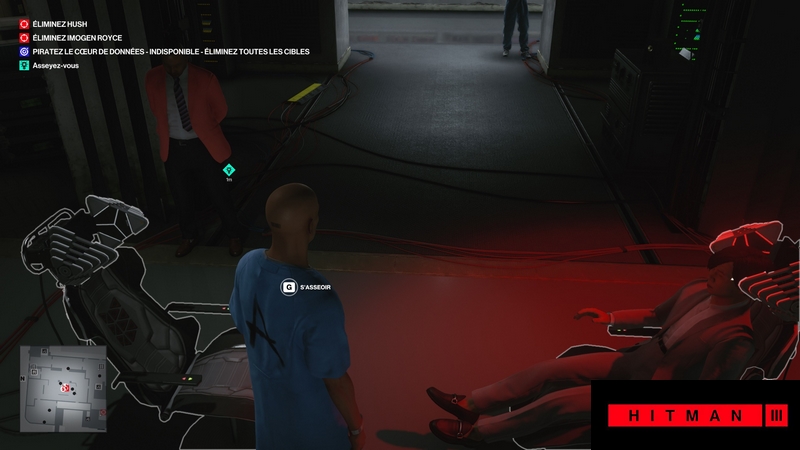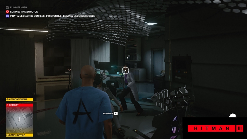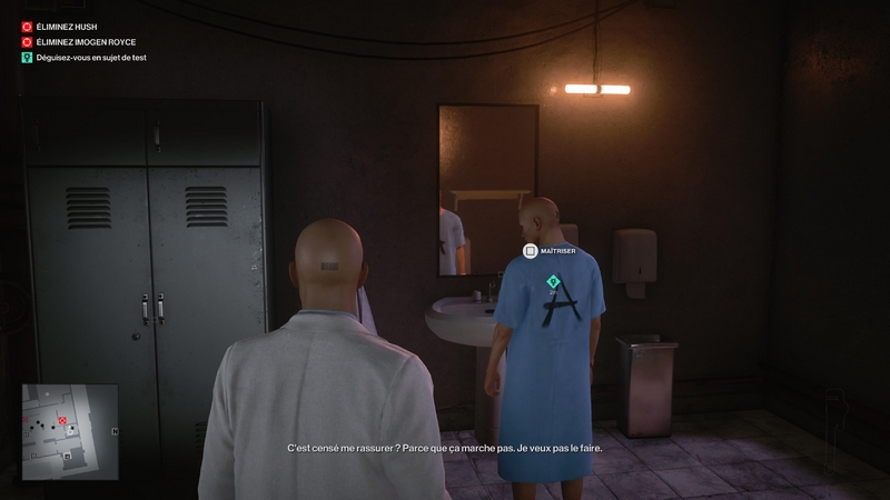 Une fois que vous avez atteint le dernier étage où Hush (votre cible) vous attend, vous devrez entrer dans la salle de bain et assommer le sujet de test. Cachez son corps et prenez son déguisement.