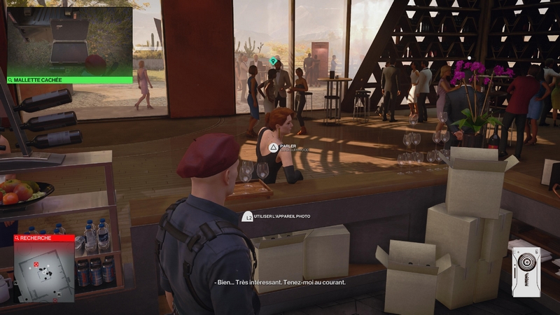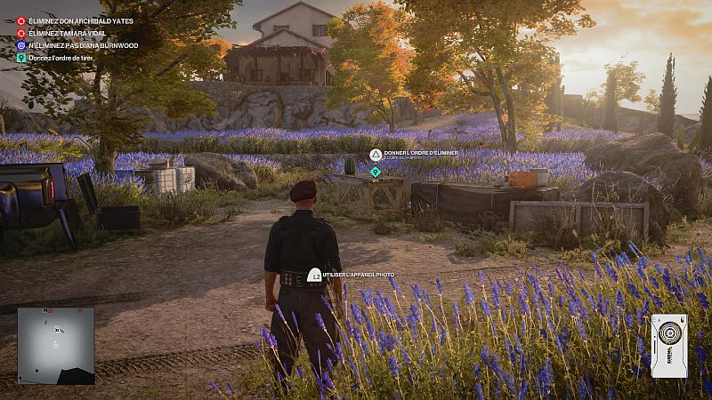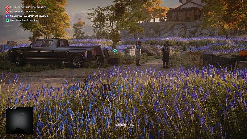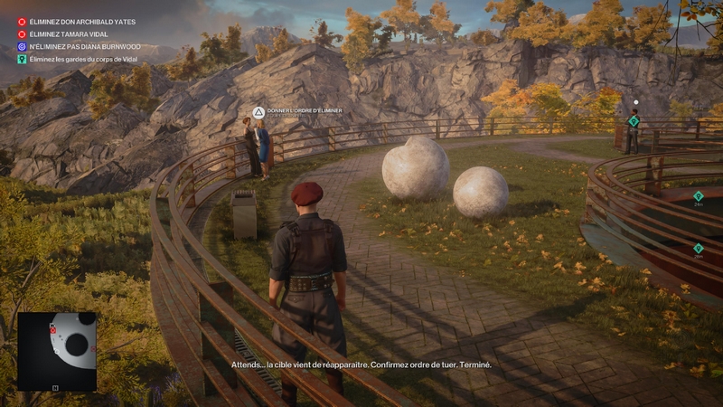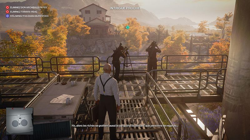 Parlez à Diana pour lui faire savoir de se déplacer vers les jardins, d’où l’équipe de tireurs d’élite vise librement Tamara. Diana sera marquée en contour bleu lorsque vous tenez R1/ RB et elle est toujours proche de Tamara. Vous pouvez être à quelques mètres d’elle pour entamer la conversation. Approchez-vous d’un côté où les gardes du corps ne regardent pas.