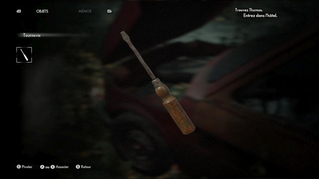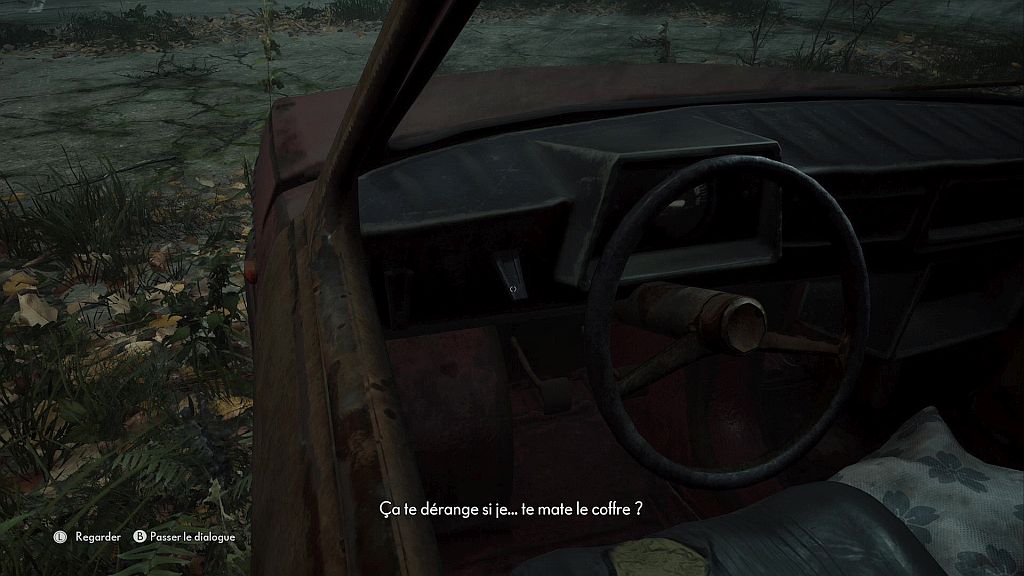 Il y a un papillon dessiné à la craie à côté de la fenêtre et une carte postale à collectionner sur le siège. Un interrupteur sur le tableau de bord ouvrira le coffre de la voiture. À l’intérieur se trouve un tournevis dont nous aurons besoin plus tard.