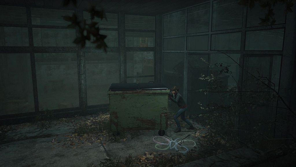 Maintenant, nous pouvons partir et traverser le parking à droite. Il y a un pilier juste avant la cour que vous pouvez examiner, détaillant la fondation de Niwa. Continuez dans cette direction lorsque la caméra change, vers le côté opposé de la cour. Continuez un peu et vous trouverez à nouveau un motif de marelle écrit à la craie. Tout à fait normal de trouver dans un hôtel abandonné, non? Utilisez votre vision et vous verrez des empreintes de pas.