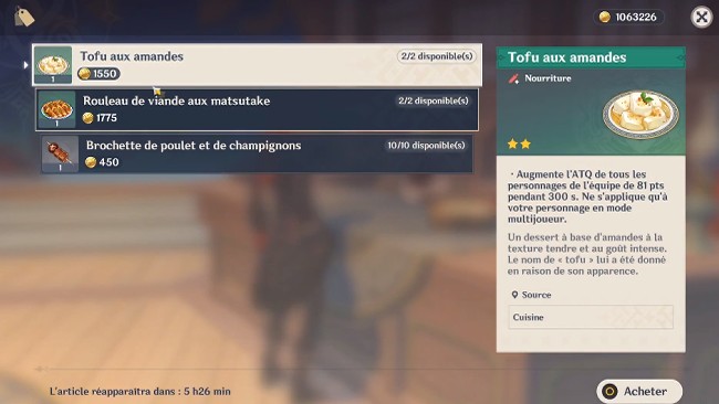 Si vous vous demandez ce que fait le tofu aux amandes, il augmente l’ATK de tous les membres du groupe de 66 à 95 pendant 300 secondes. Mais si vous jouez en mode coopératif avec un ami , l’effet ne s’appliquera qu’à vos personnages et non aux leurs.