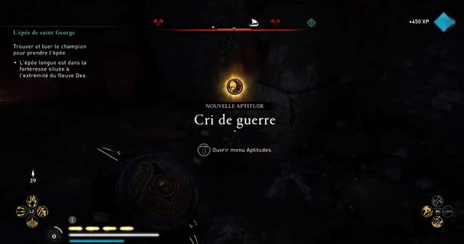 Cri de Guerre : C’est une aptitude au corps à corps. Dans un accès de rage, Eivor laisse échapper un cri glaçant, qui lui donne des forces et amène l’ennemi à cesser ses attaques et à reculer en titubant.