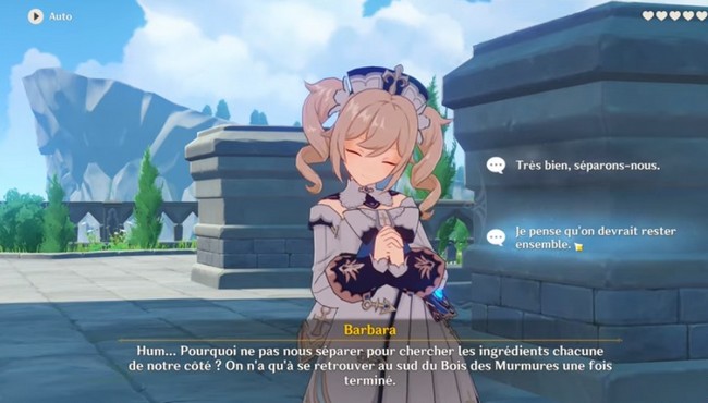 - Dites à Barbara «Une minute Barbara. Il est quand même suspect…On devrait d’abord l’escorter jusqu’à l’Ordre de Favonius. » lorsqu’elle suggère de soigner le trésorier.