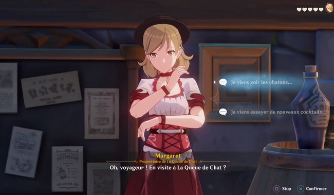 On commence par la quête « La barmaid de La Queue de Chat », vous devez parler avec Margaret et lui dire que : « Je viens essayer de nouveaux cocktails …