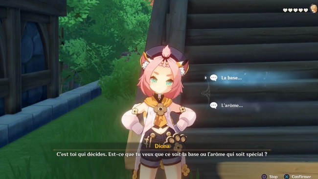Une fois sur place, Diona dit qu’elle veut utiliser une mixture Brutocollinus comme base pour ses cocktails vous devez choisir :