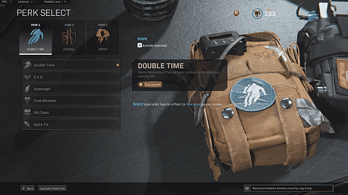Double Time vous permet de sprinter plus longtemps et augmente votre vitesse de mouvement accroupi. Cela vous permet de manœuvrer rapidement entre le tir à couvert et le tir mitraillé pour être une cible difficile.