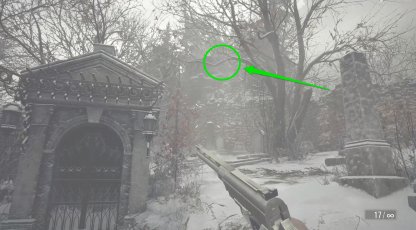 L’oiseau bleu qui laisse tomber le Gibier juteux se trouve perché sur une branche du cimetière du village, juste à côté de la porte du château Dimitrescu. Il apparaîtra une fois que vous aurez terminé le château Dimitrescu.