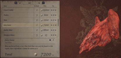 Vous pouvez vendre le Gibier juteux à Duc pour 7200 Lei. Faites-le si vous prévoyez d’obtenir plus de Lei, en particulier pendant New Game Plus.