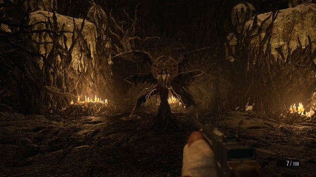 Le premier masque est assez facile à trouver. Parcourez normalement la section du jeu consacrée au château Dimitrescu. Vous éliminerez l’une des filles de Lady Dimitrescu dans un court combat de boss, obtiendrez la clé de la Cour pour accéder à la partie extérieure du château, puis résoudrez l’énigme de la Salle d’ablations.