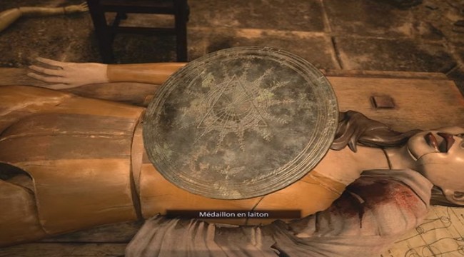 4. L’examen de la poitrine révélera des bandages que vous pourriez couper avec un ciseau ( à récupérer sur une poupée après avoir résoudre l’énigme du bureau) : Médaillon en Laiton