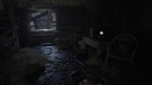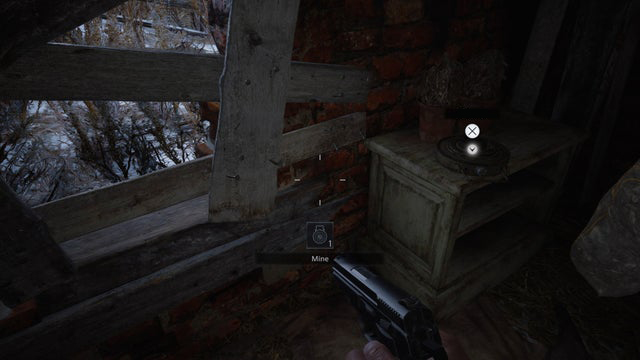 Avant de faire le dangereux voyage à travers le champ en Jachère, cherchez une cabane proche sur la gauche et inspectez les pièces pour trouver de la Poudre noire, de la Ferraille, des Munitions pour pistolet dans un tiroir et une Mine.