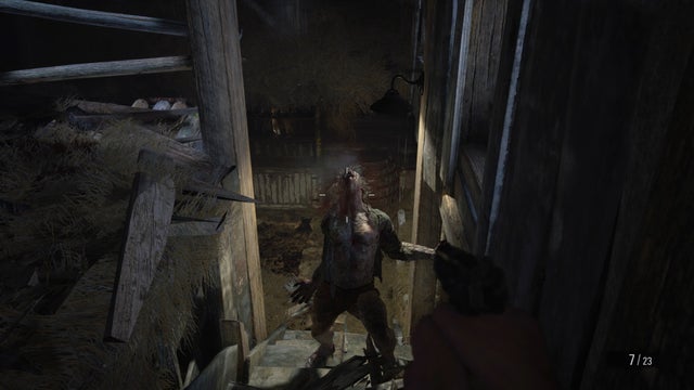 En passant la porte, vous pouvez traverser une petite rivière qui est bloquée des deux côtés – et entrer dans un grand bâtiment de type grange. A l’intérieur, vous entendrez le bruit d’une radio statique – mais il s’arrêtera dès que vous approcherez, à peu près au moment où quelque chose frappera à l’étage. Assurez-vous de ramasser les munitions d’armes de poing près de la fenêtre, puis dirigez-vous vers les escaliers et montez jusqu’en haut. Il y a plus de munitions de pistolet ici, ainsi qu’un fluide chimique sur le sol – mais dès que vous les aurez pris, des Lycans apparaîtront dehors.
