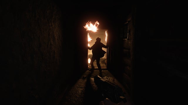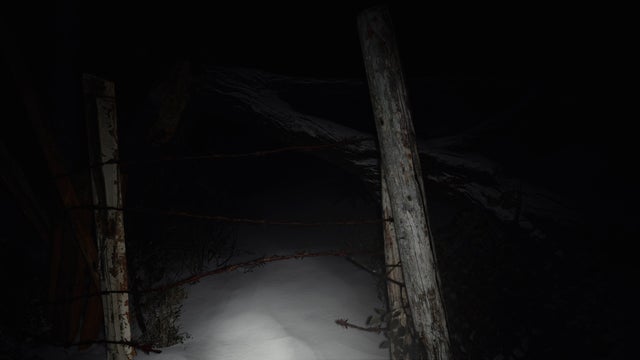 Lorsque vous arrivez à une impasse, accroupissez-vous pour passer sous des barbelés, puis continuez jusqu’à ce que vous puissiez descendre dans une zone en contrebas. Vous pouvez même remarquer que quelque chose bouge devant vous – ne vous en inquiétez pas pour l’instant, continuez à avancer jusqu’à ce que vous traversiez une petite passerelle et que l’image d’une maison inquiétante apparaisse.