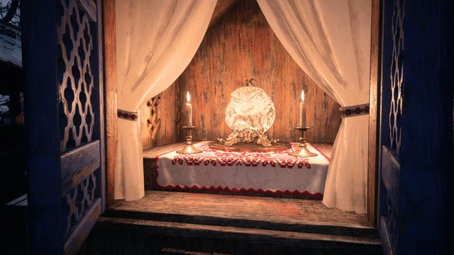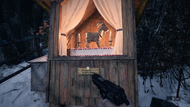 Chèvre protectrice – si vous restez à l’extrême gauche de la parcelle de jachère, vous pouvez sauter une petite barrière et remonter un petit chemin jusqu’à un mur de pierre derrière une cabane. Bien que ce soit une impasse, regardez sur le mur de pierre pour repérer une autre chèvre en bois que vous pouvez abattre avec votre arme de poing.