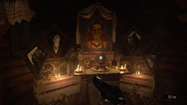 En vous déplaçant vers la grande église, vous pouvez vous rendre à l’intérieur pour trouver votre premier véritable point de sauvegarde, une machine à écrire ! Pendant que vous êtes ici, vous pouvez réclamer le premier Morceau de relief (vierge) à l’avant d’un sanctuaire, et vous remarquerez une grande représentation de la photo encadrée que vous avez trouvée plus tôt, ainsi que 4 autres photos qui ne peuvent être que les grands Boss du jeu. Regardez-les bien – ce n’est pas la dernière fois que vous les verrez. Vous pouvez également regarder le long des photos sur le mur au-dessus du sanctuaire pour voir un autre fragment de cristal que vous pouvez abattre et collecter.