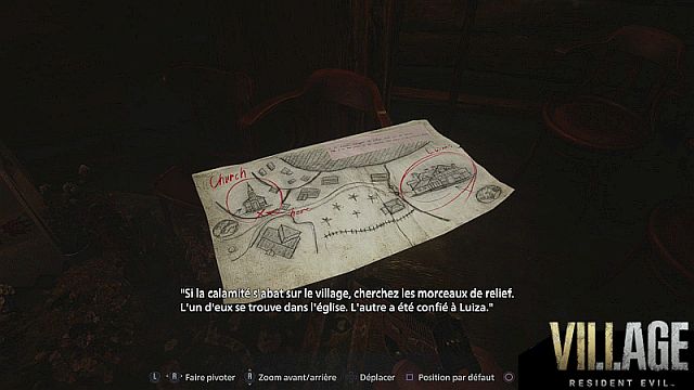 Quant à l’autre morceau de relief, regardez sur une chaise voisine pour apercevoir une carte du village, montrant que l’autre morceau de relief se trouve tout près. Vous pouvez l’atteindre en cherchant un chemin à droite de l’église, où un grand champ vous sépare de l’autre maison.