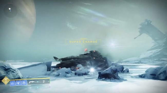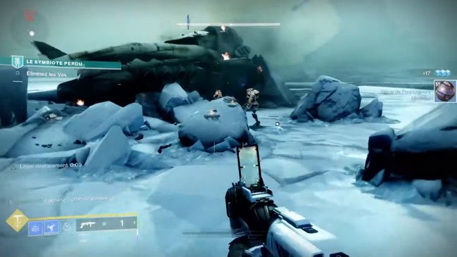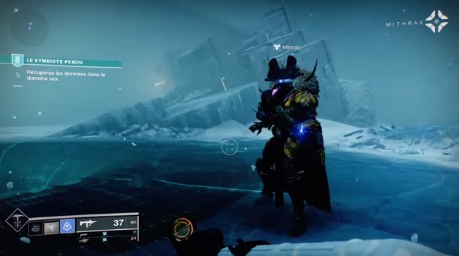 Après avoir quitté le navire, une tempête de neige se lève. Cette tempête de neige rend la navigation difficile. Utilisez votre marqueur pour vous diriger vers la prochaine localisation de Mithrax qui se trouve près des ruines d’Abysse d’asterion. Lorsque vous vous en approcherez, vous déclencherez une scène d’action. Après cette scène, vous rencontrerez Mithrax en personne. Une brève conversation s’ensuit, puis Mithrax et vous devez récupérer des données du domaine Vex.