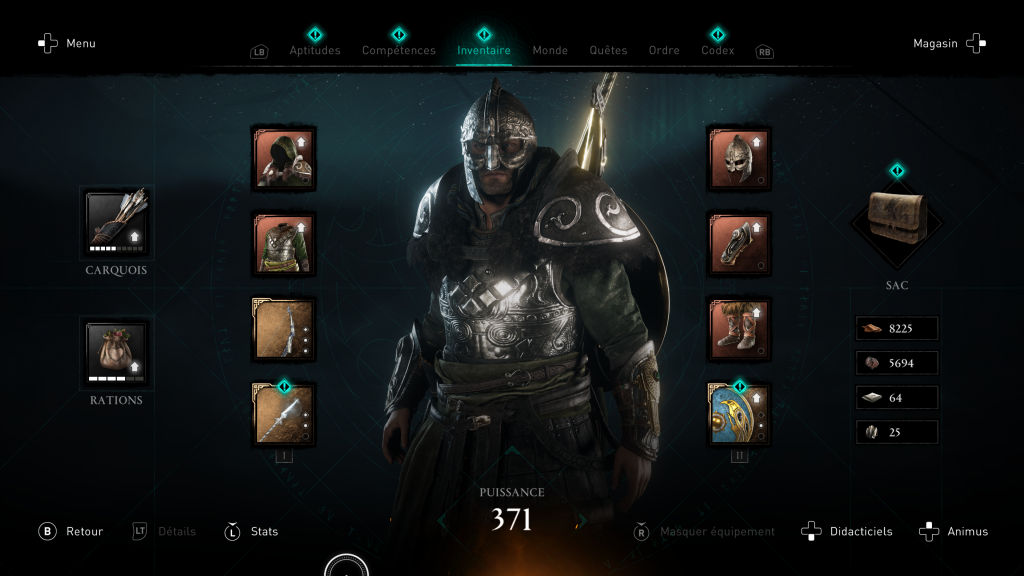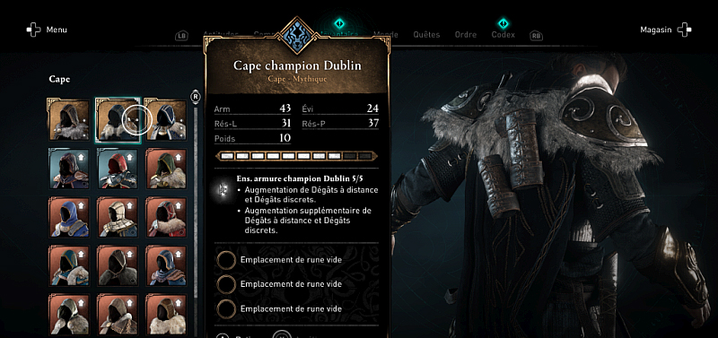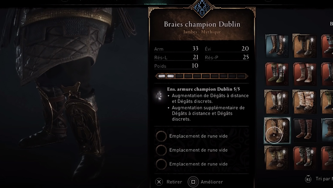 Il y a 5 pièces: brassards, cape, casque, braies, armure. Les 3 premiers sont des récompenses pour avoir augmenté la renommée de Dublin en donnant des matériaux commerciaux au marchand Azar. Les 2 derniers sont obtenus en battant les deux « Drengr » à Connacht et Ulster. Rien n’est manquable, vous pouvez toujours les obtenir après l’histoire.
