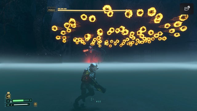 Après cela, il tirera un grand nombre d’orbes orange dans l’air au-dessus de vous. Celles-ci vont rapidement s’étendre et pleuvoir d’en haut – ne les laissez pas vous toucher. Pendant ce temps, Phriké vous enverra un flot de projectiles violets. Ceux-ci arrivent en ligne droite et ont un léger effet de suivi. Nous vous recommandons d’esquiver ces projectiles tout en évitant également les orbes orange qui tombent du ciel.