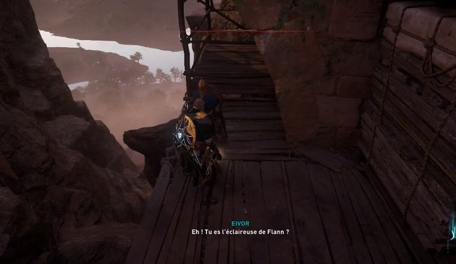 Une fois que vous avez fini de parler avec Barid, vous devez aller trouver l’éclaireuse au nord. L’éclaireuse est assez loin, alors sautez sur votre monture et dirigez-vous vers le marqueur de quête. Utilisez votre vision d’Odin une fois à proximité, passez sous le pont pour le trouver sur des plateformes en bois. Parlez avec lui.