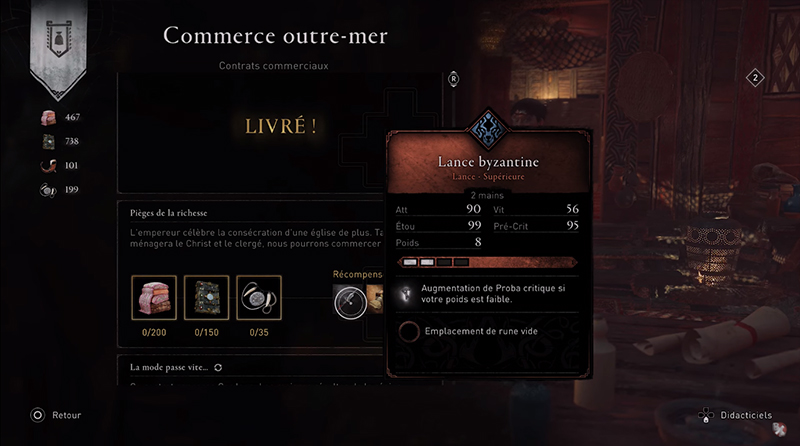 • Pièges de la richesse : terminer ce contrat commercial vous rapportera la Lance byzantine.