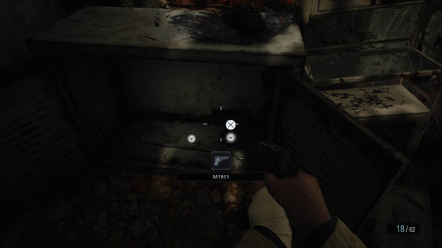 En déverrouillant l’armoire, vous découvrirez une nouvelle arme, le pistolet M1911, ainsi que la Manivelle de cric pour le tracteur.