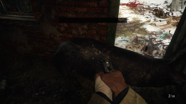 Vous pouvez aussi maintenant déverrouiller le tiroir de la maison avec le crochet  pour obtenir des Munitions de pistolet. Cependant, si vous enquêtez dans la grange sur le côté de la maison, vous rencontrerez un cochon qui peut être tué pour avoir 2 viandes.