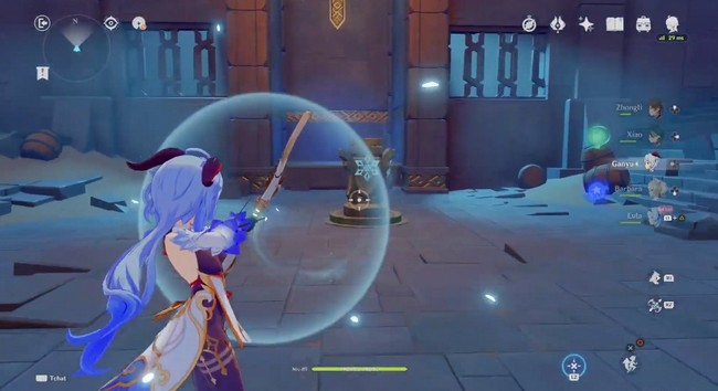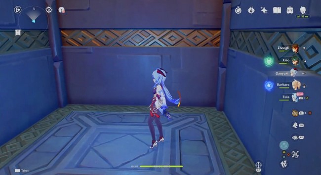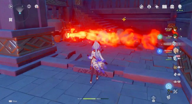 Après eux, vous trouverez une pièce plus grande avec un Anemo, un Geo et un Pyro Fatui. Dans cet endroit, vous pouvez jouer en tant qu’Eula. Il y a ici quelques pierres Hydro que vous pouvez frapper pour vous aider à geler les ennemis, ce que je vous recommande de faire. Faites aussi très attention aux lance-flammes qui se trouvent dans la zone car ils font mal.
