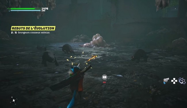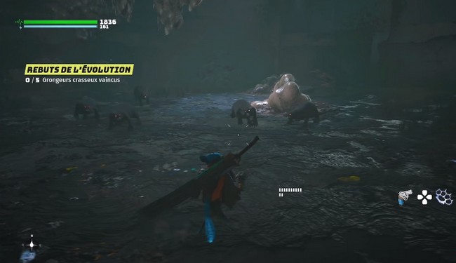 Continuez à monter l’escalier et vous arriverez dans une grande pièce. Cinq Grongeurs crasseux tomberont du plafond et vous serez obligé de tous les affronter en même temps. Cela vous permettra de pratiquer vos compétences de combat multi-ennemis, ainsi que d’apprendre à utiliser vos mutations.