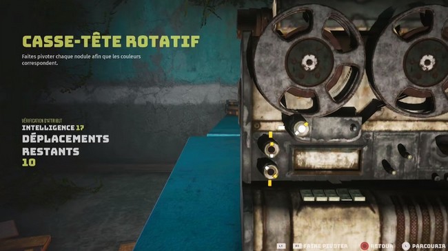 Vous aurez un nombre limité de rotations, mais pour ce puzzle, vous devez simplement faire tourner le cadran du milieu de façon à ce que les extrémités blanche et jaune touchent la couleur correspondante sur les cadrans opposés.