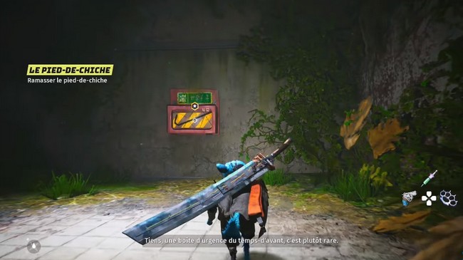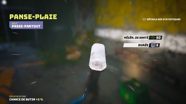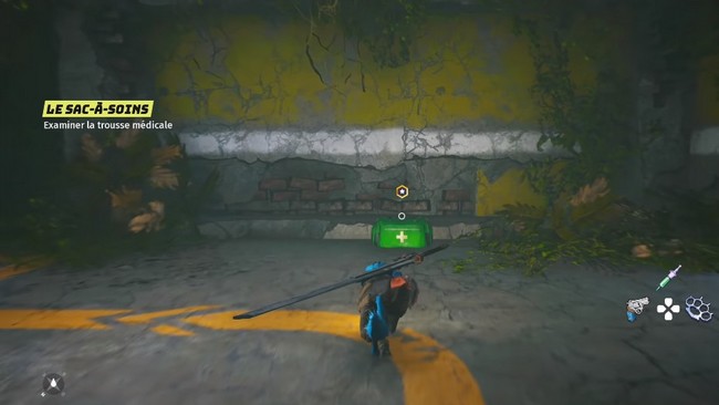 Continuez dans le coin et vous trouverez une trousse médicale sur le sol. Interagissez avec elle pour obtenir un patch de santé. Cet objet vous permet de vous soigner pendant le combat car votre santé ne se régénère pas automatiquement.