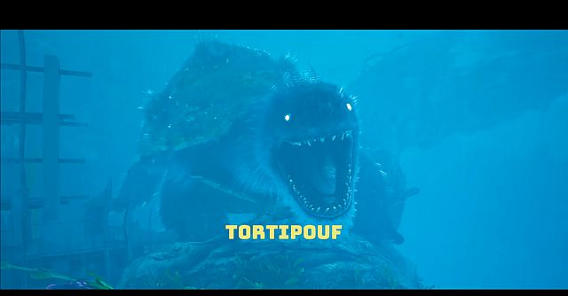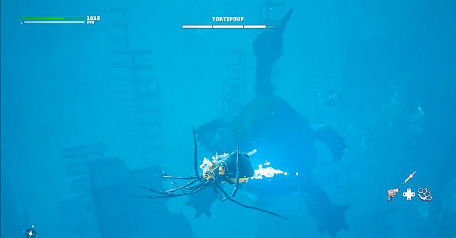 Tortipouf commence de l’autre côté de l’arène et vient s’écraser sur le bâtiment central, le brisant au passage. L’eau étant trouble, il est un peu difficile de voir le boss. (Je suppose que c’est pour cela qu’on l’appelle Tortipouf).