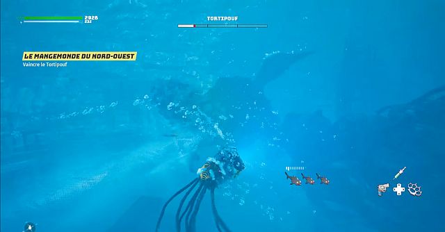 Après avoir obtenu l’Octopod de Whiz et vous être familiarisé avec ses commandes, nagez vers le marqueur de quête pour déclencher une scène et commencer ce combat de boss.