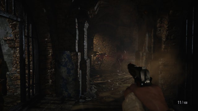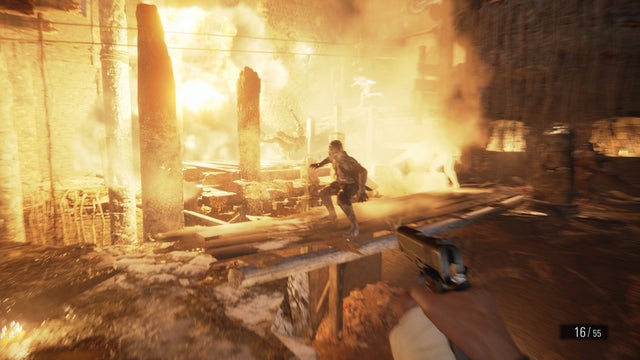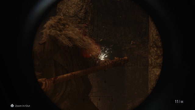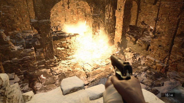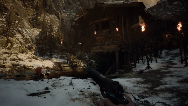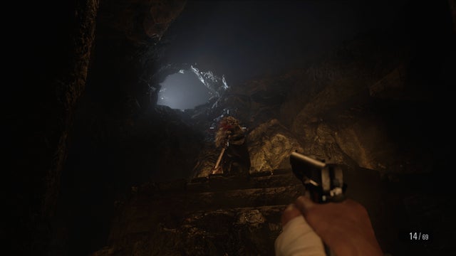 Si vous avez affronté les géants ailleurs dans le village, le combat se déroulera de la même manière. Il peut bondir sur vous depuis la corniche supérieure, alors courez rapidement sous son saut, tournez-vous et tirez une cartouche explosive pour le faire reculer, puis enchaînez avec des tirs de fusil à pompe.