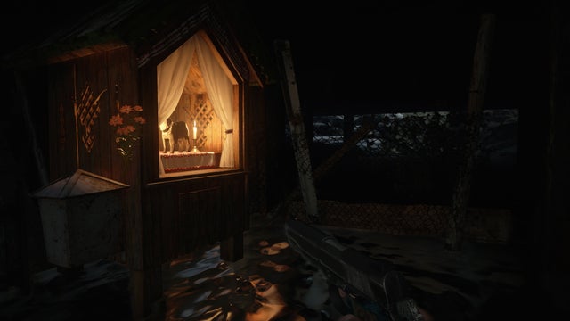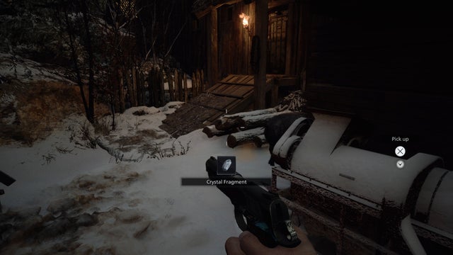 Puisque la porte sur le côté droit du moulin est verrouillée, traversez le ruisseau jusqu’à l’autre côté pour trouver une caisse près d’une porte cadenassée que vous pouvez détruire. A l’intérieur de l’enclos se trouve un cochon que vous pouvez éviscérer pour 2 Viande, et une foule d’objets dont une caisse et 2 Mines. Tournez autour d’eux et vous trouverez un fragment de cristal au sommet d’un vieux générateur recouvert de neige, puis entrez dans le moulin.