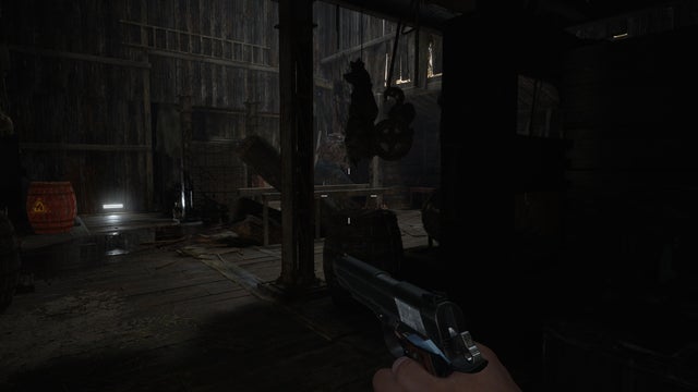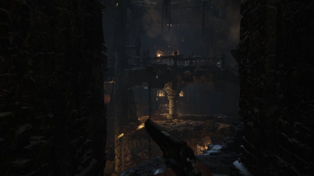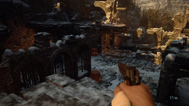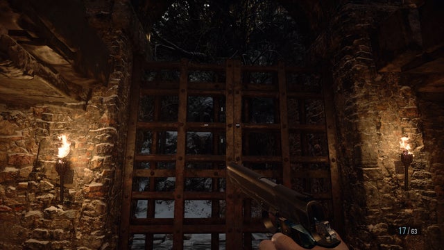 En entrant dans la grande zone devant la porte de la forteresse, remarquez les deux barils explosifs sur la droite, et un sur un haut rebord à gauche. Cassez les caisses à proximité et prenez d’abord les munitions de pistolet et les cartouches de fusil avant de vous rendre aux niveaux supérieurs où il y a deux leviers différents pour ouvrir la porte.