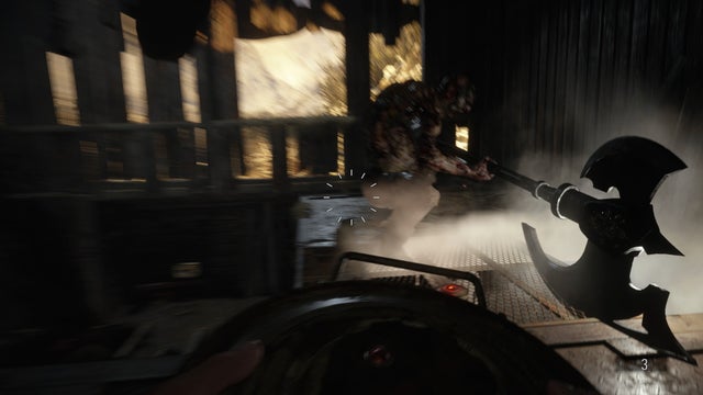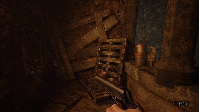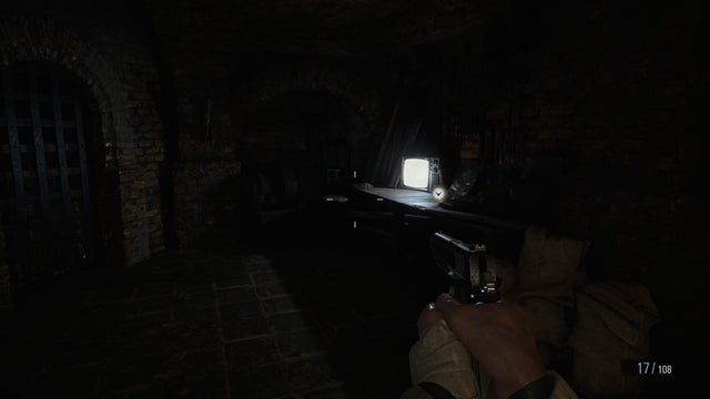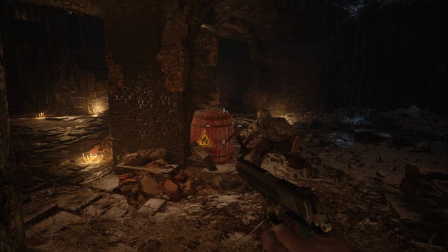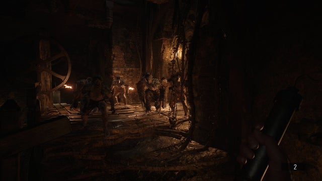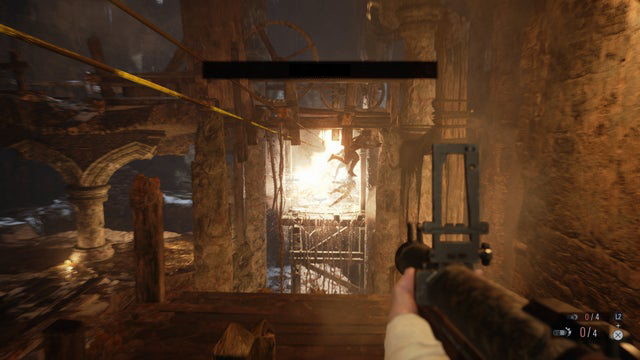 Si vous traversez au milieu de la pièce, une horde de Lycans apparaîtra, et vous pourrez faire exploser le baril – et lancer une bombe artisanale sur le petit pont lorsque le groupe essaiera de traverser vers vous.
