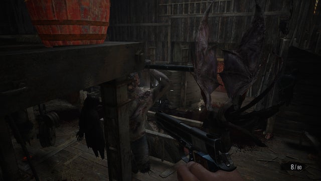À certains moments, il appellera des renforts, mais il n’y aura pas de goules cette fois-ci. À la place, il invoquera des créatures ailées pour l’aider à combattre. Ce n’est pas si grave que ça, car ces ennemis tournent en général autour de vous pendant un long moment avant d’attaquer, et vous pouvez soit les attraper avec une explosion de vos armes, soit vous retourner rapidement et les remplir de cartouches de fusil à pompe pour les tuer rapidement. Il y a également deux barils rouges que vous pouvez utiliser pour interrompre le géant et détruire ses amis par la même occasion.