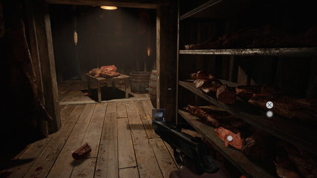 Dans l’entrepôt du cannibale, vous trouverez une tonne de viande à donner au Duc, dont 3 viandes, 1 volaille et 1 poisson. La pièce contient également une plante pour reconstituer votre santé, ainsi que de la ferraille et le document Journal d’Ernest sur la table.