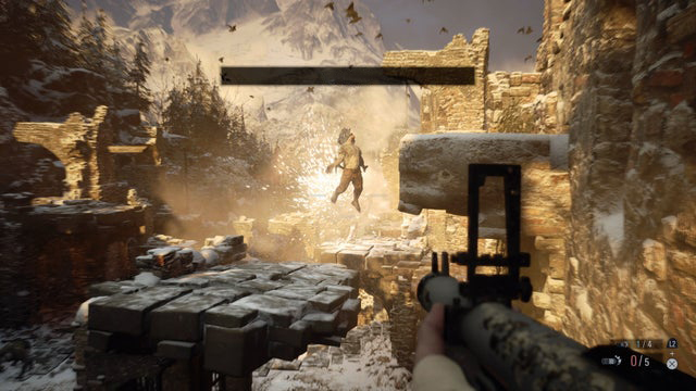 Prenez le chemin de gauche et regardez si d’autres Lycans sautent d’en haut, puis avancez prudemment pour trouver deux Archers Lycans qui essaient de vous tirer dessus depuis les ruines. Utilisez votre fusil de sniper si vous le pouvez pour riposter, puis avancez jusqu’à l’abri proche avec une caisse cassable. Il y a une autre caisse sur la droite avant que vous n’entriez vous-même dans les ruines.