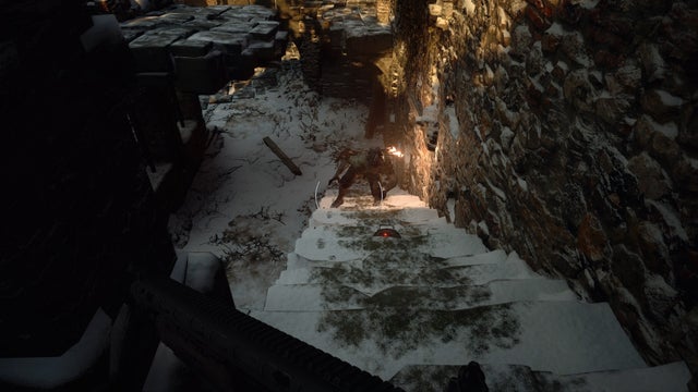 Préparez-vous à une attaque de lycans lorsque vous atteindrez une zone ouverte avec plusieurs rebords – et prenez le chemin jusqu’à un petit pont qui surplombe la zone.